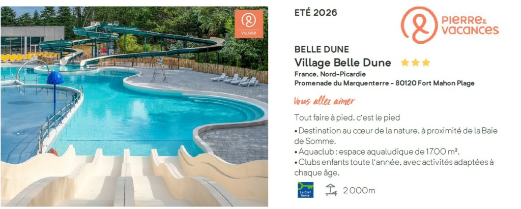 Village Belle Dune Pierre & Vacances est un village de vacances piétonnier et éco-responsable situé à Fort-Mahon-Plage, au cœur de la Baie de Somme entre dunes, forêts de pins et lacs. Il propose des maisons et appartements colorés d’inspiration picarde dans un vaste domaine naturel de 250 ha, à seulement 2 km de la mer.