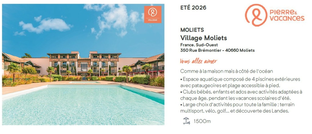 Le Village Moliets – Pierre & Vacances est un village de vacances piétonnier niché au cœur d’une pinède landaise, à environ 1,5 km de l’océan Atlantique, idéal pour des vacances en famille ou entre amis. Il propose des maisons et appartements confortables, un grand espace aquatique avec 4 piscines extérieures et pataugeoires, ainsi que des clubs enfants/ados et de nombreuses activités sportives (vélo, golf, surf, tennis, multisports). L’ambiance est conviviale et naturelle, avec la plage accessible à pied ou à vélo pour profiter des Landes.